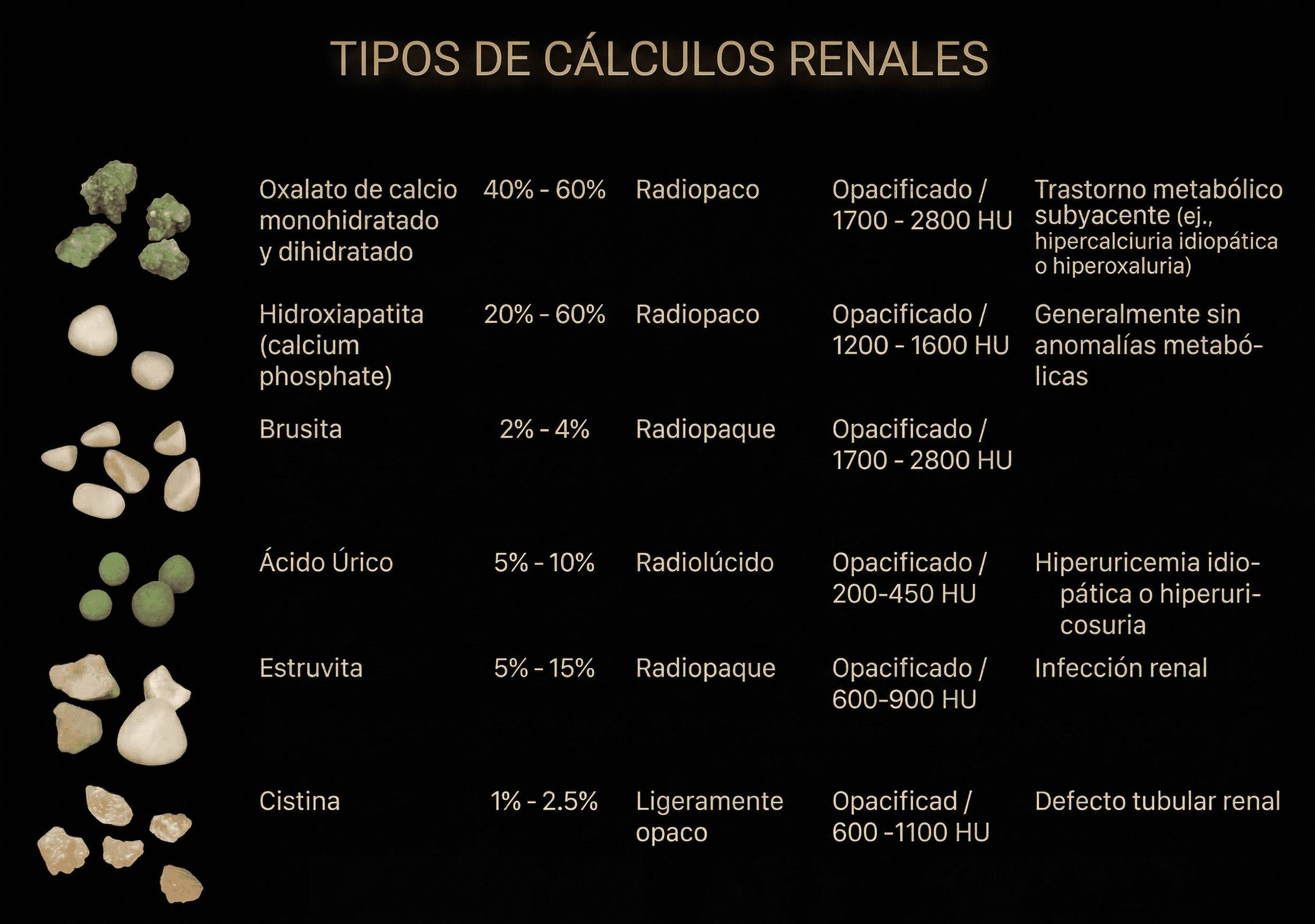 La composición del cálculo tiene implicaciones diagnósticas y terapéuticas importantes.