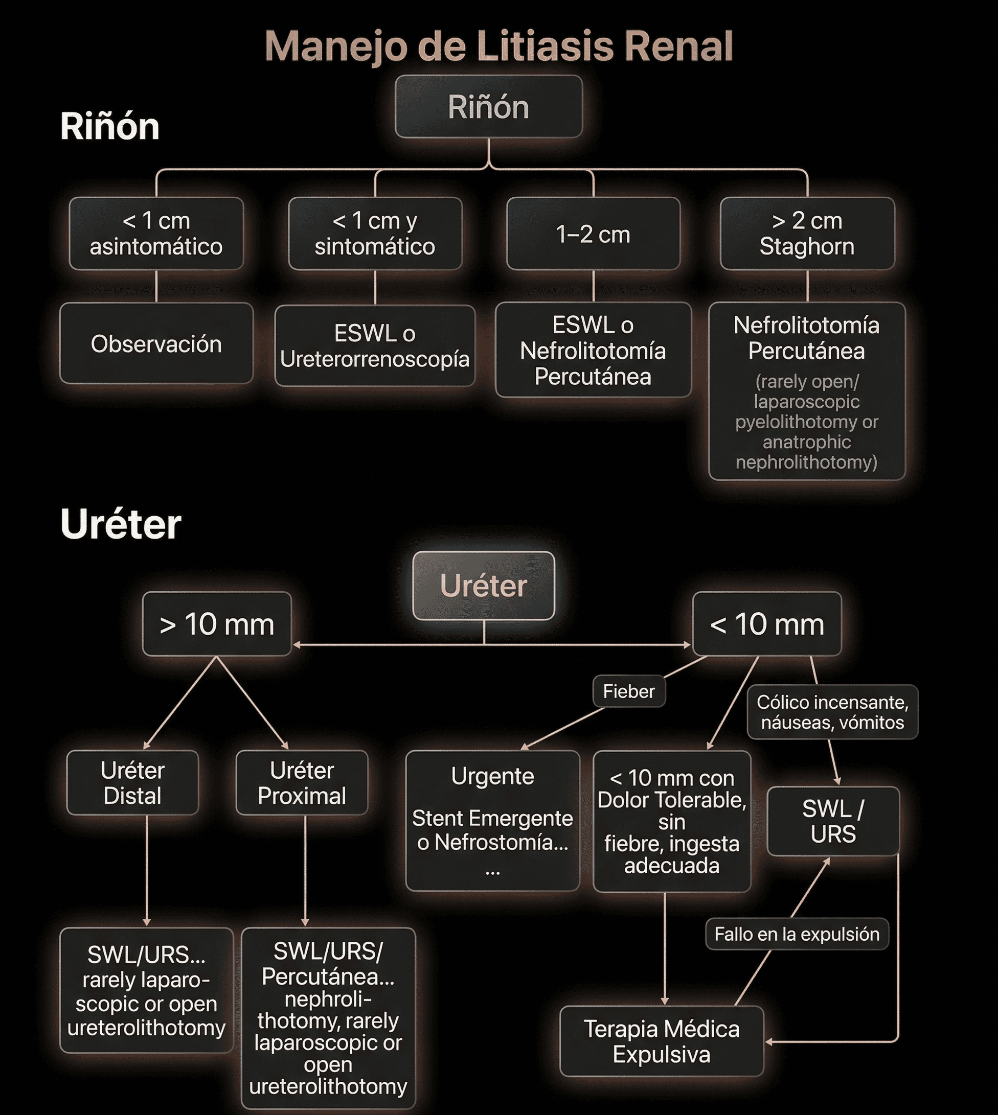 Estos datos ayudan a determinar si el paciente es candidato a manejo conservador, litotricia extracorpórea o intervención endourológica.