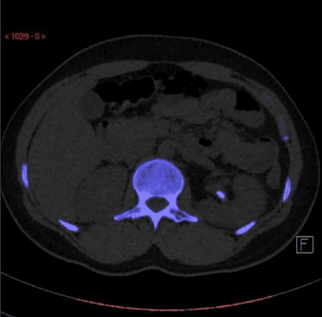 Tomografía computarizada de energía dual (DECT) en corte axial que muestra un cálculo localizado en el uréter proximal derecho, identificado mediante codificación espectral característica de los cálculos de ácido úrico. Esta técnica permite diferenciar de forma no invasiva entre litiasis de ácido úrico y cálculos cálcicos al analizar la atenuación del material a diferentes niveles de energía, información con implicaciones terapéuticas relevantes, ya que los cálculos de ácido úrico pueden responder a tratamiento médico mediante alcalinización urinaria.
