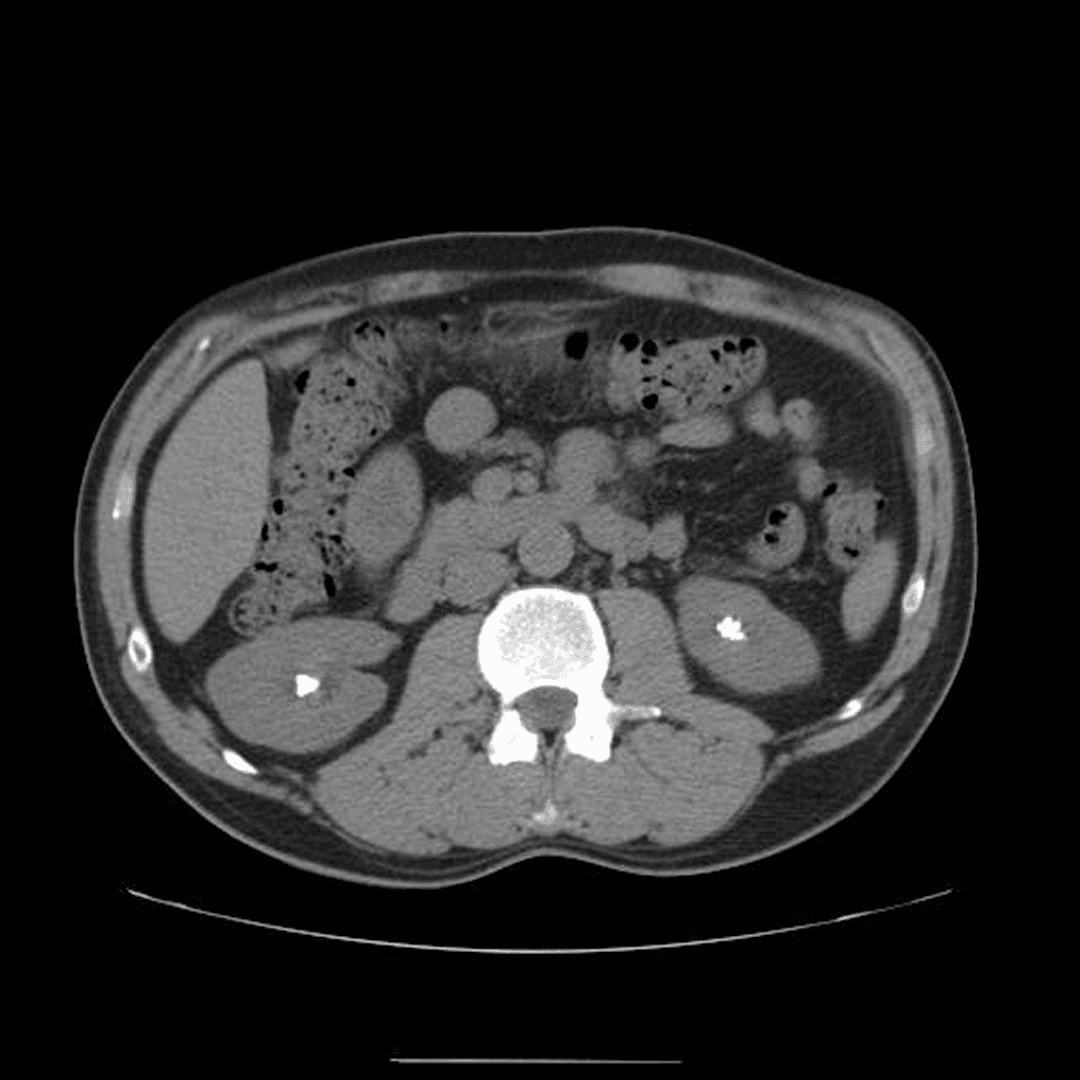 Tomografía computada de abdomen sin contraste en corte axial que muestra ambos riñones con morfología conservada y la presencia de litiasis hiperdensas localizadas en los cálices renales de manera bilateral. Los cálculos presentan una atenuación promedio de 1201 unidades Hounsfield (UH), hallazgo altamente sugestivo de composición rica en fosfato de calcio, uno de los subtipos de mayor densidad en urolitiasis. No se identifican signos de obstrucción urinaria asociados, como dilatación pielocalicial o cambios inflamatorios perirrenales, por lo que los hallazgos son compatibles con nefrolitiasis calicial bilateral no obstructiva.