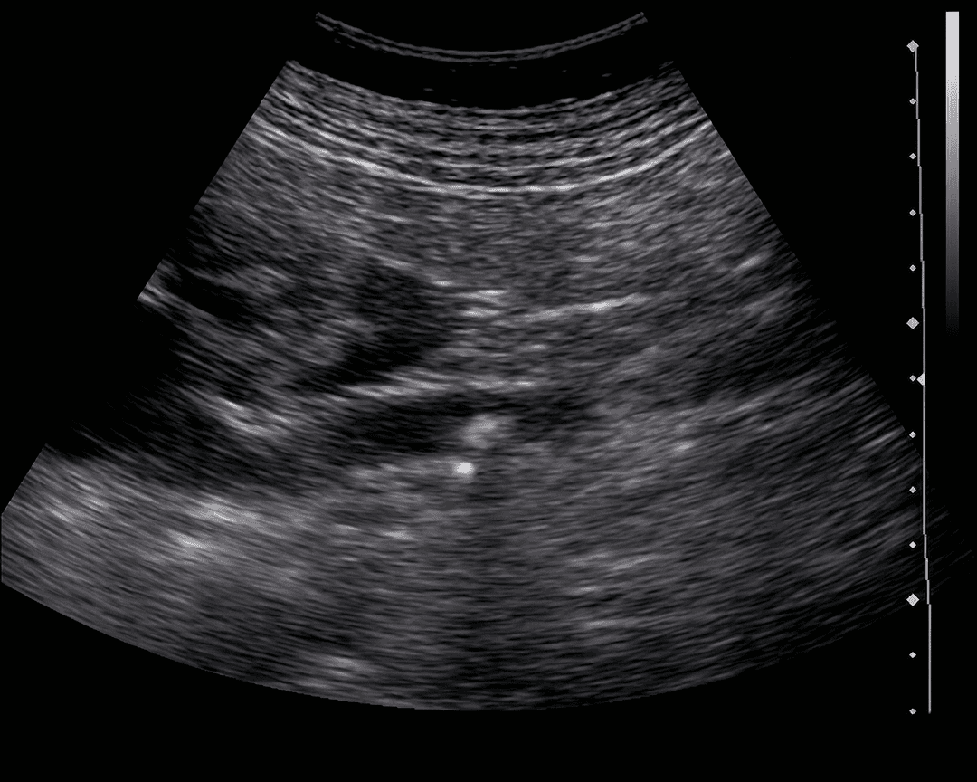 Ultrasonido renal realizado con transductor convexo que demuestra un foco hiperecogénico compatible con litiasis en el sistema colector, asociado a sombra acústica posterior, hallazgo característico de cálculos calcificados. Se observa además dilatación retrógrada del sistema pielocalicial (hidronefrosis), lo que sugiere obstrucción urinaria secundaria. El ultrasonido constituye una modalidad inicial ampliamente utilizada en la evaluación de urolitiasis, particularmente en pacientes pediátricos y embarazadas, permitiendo identificar tanto el cálculo como las repercusiones obstructivas sobre el riñón.
